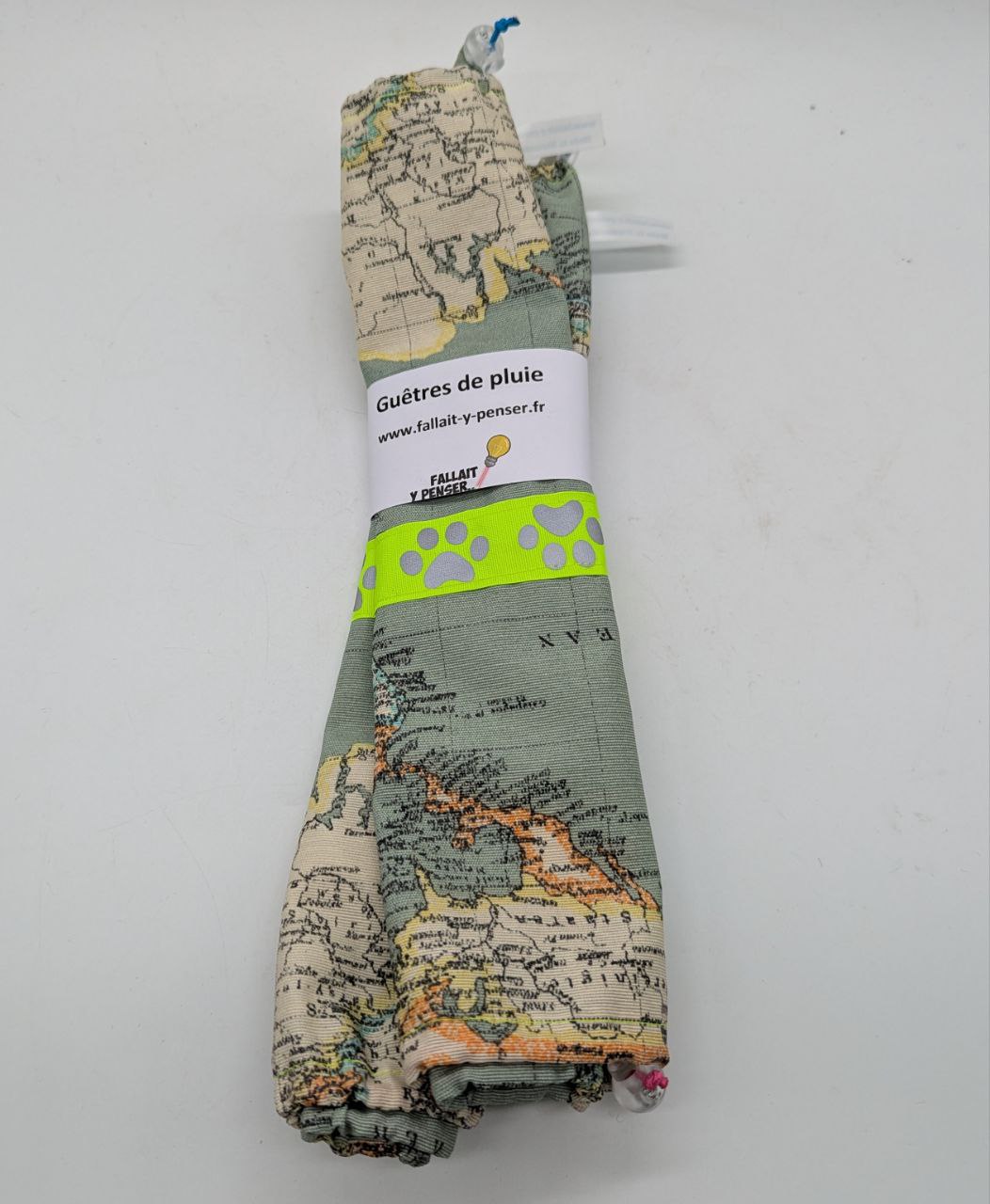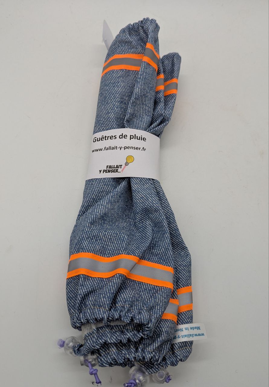 Les guêtres sont réalisées dans un tissu imperméable, muni d’une bande réfléchissante et fermées sur par des velcros, réglable en bas et en haut par cordons élastiques et stop-cordon.