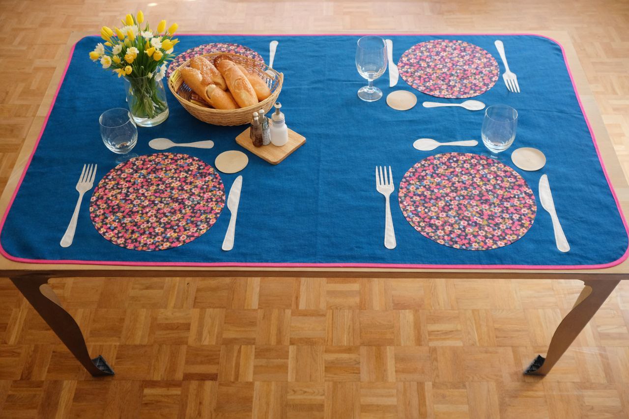 Nappe en coton et polyester gansée d’un biais coton, ornée d’un ensemble d’assiettes, verres et couverts.